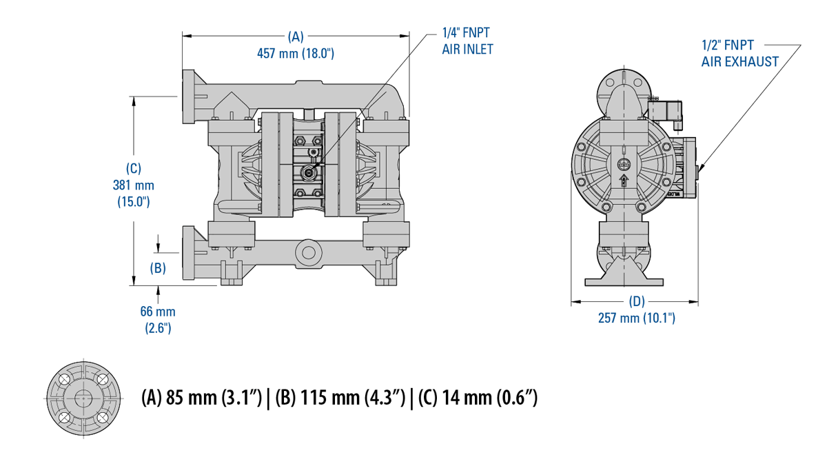 注意: 尺寸因材料和连接类型而异。更多相关信息,请参阅A200塑料泵安装手册。